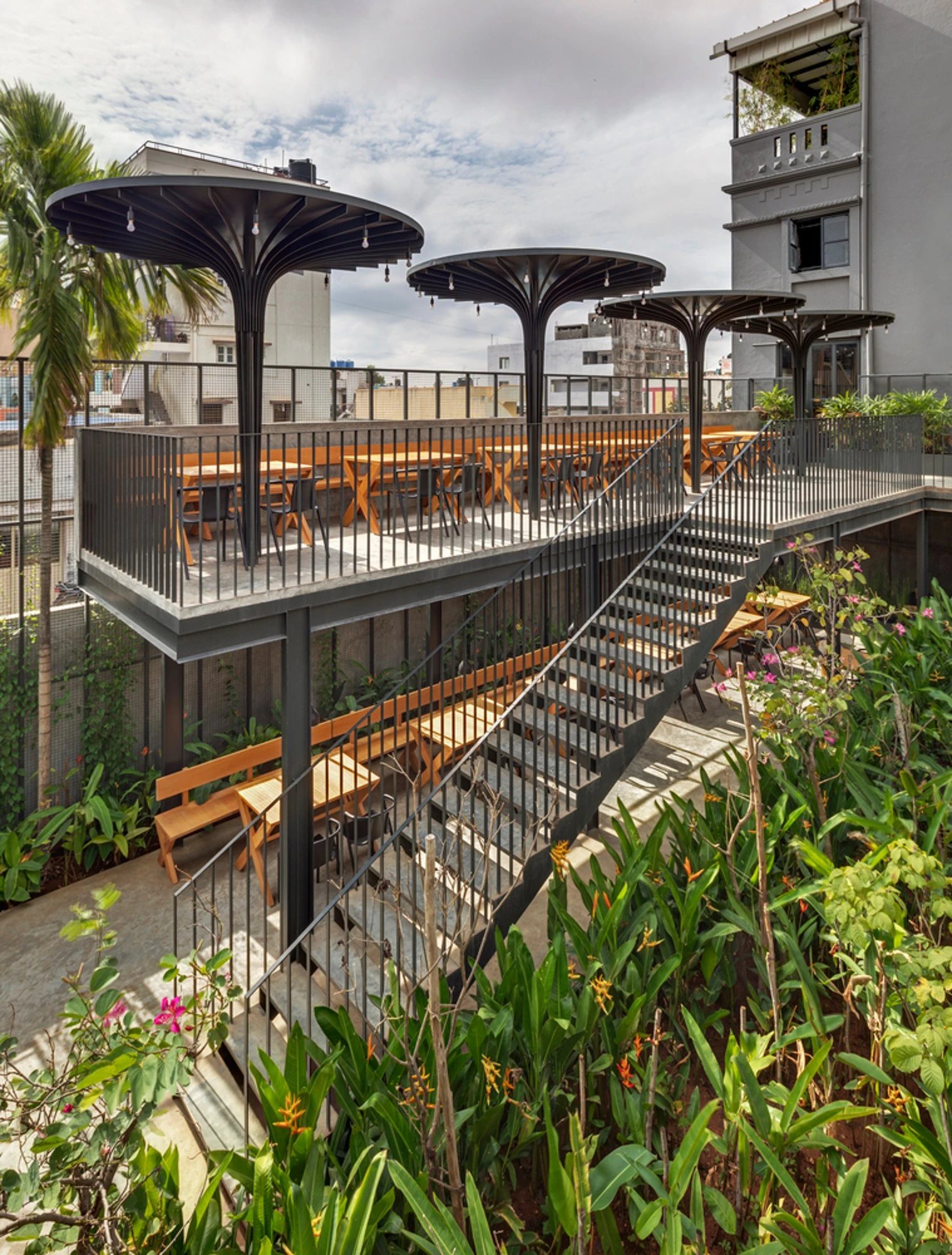 Erhöhte Sitzplätze mit üppiger Bepflanzung und modernen Schattenspendern. Ideal zum Durchatmen, Sonnenlicht genießen und entspannten Speisen im Freien.